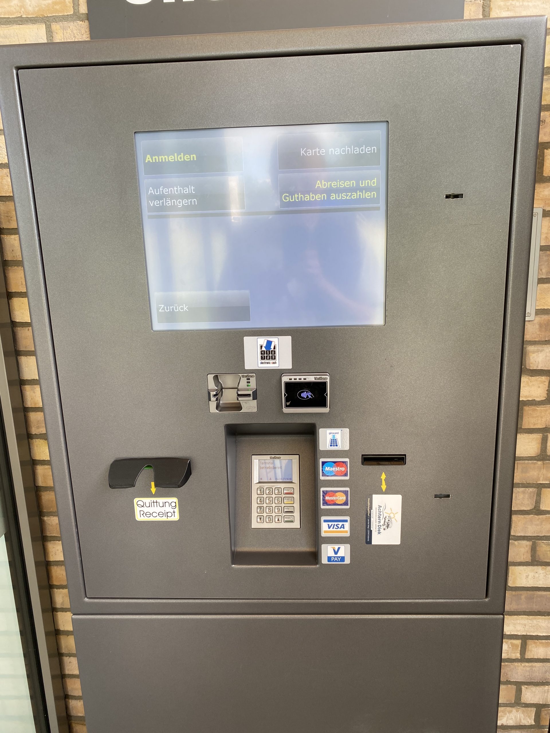 Anmelden funktioniert am Automaten und man bezahlt den Aufenthalt, Ladung für die Karte und 10€ Pfand für die Karte. Die Eingabe war recht mühsam, da man jeden Buchstaben auf dem Display 10x drücken musste.