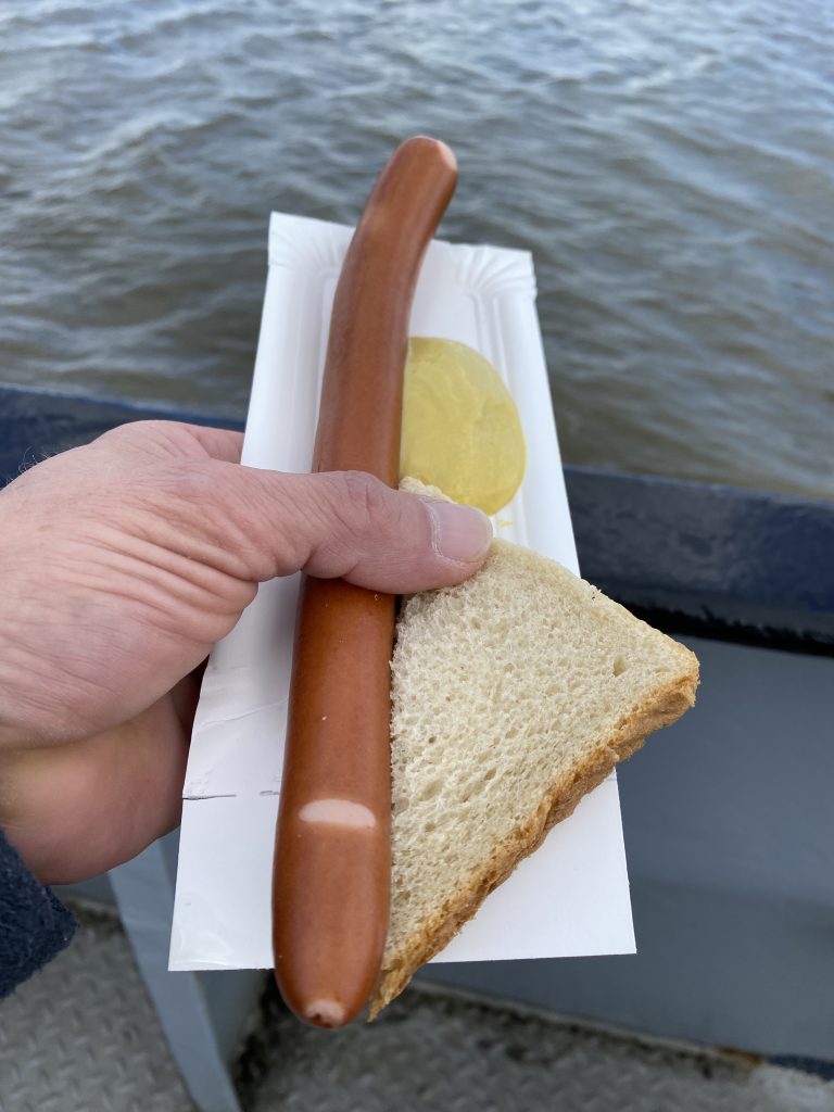 Mit Anhänger habe ich 30,50€ bezahlt. Dafür habe ich 150 km gespart, den Stau am Elbtunnel und vieeeel Zeit. Und zur Belohnung gab es eine „Fähre“ Wurst.